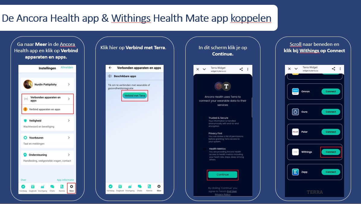 Het stappenplan hieronder laat zien hoe je de Withings health mate app koppelt aan de Ancora Health app. Dit is nodig zodat het ziekenhuis je data kan zien. 1) 2) 3) - Let op! Na het klikken op 'Gebruik deze app' krijg je geen extra bevestiging dat ...
