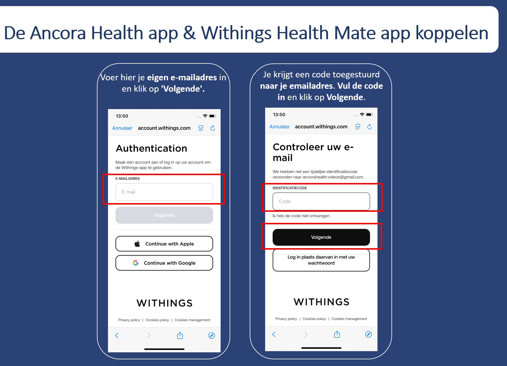 In de video hierboven leer je hoe je de Withings health mate app koppelt aan de Ancora Health app. Dit is nodig zodat het ziekenhuis je data kan zien. Je kan ook het stappenplanhieronder volgen.