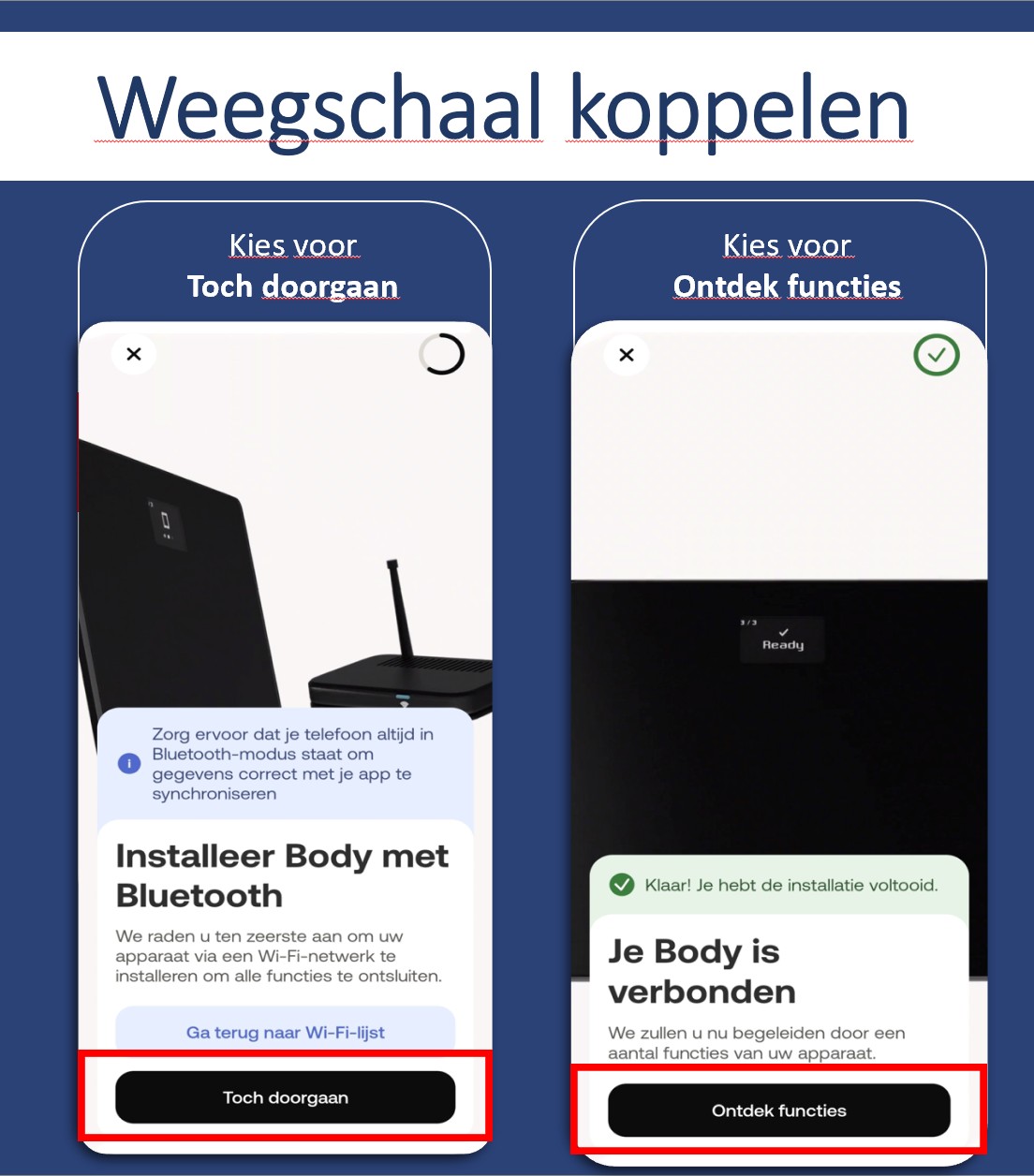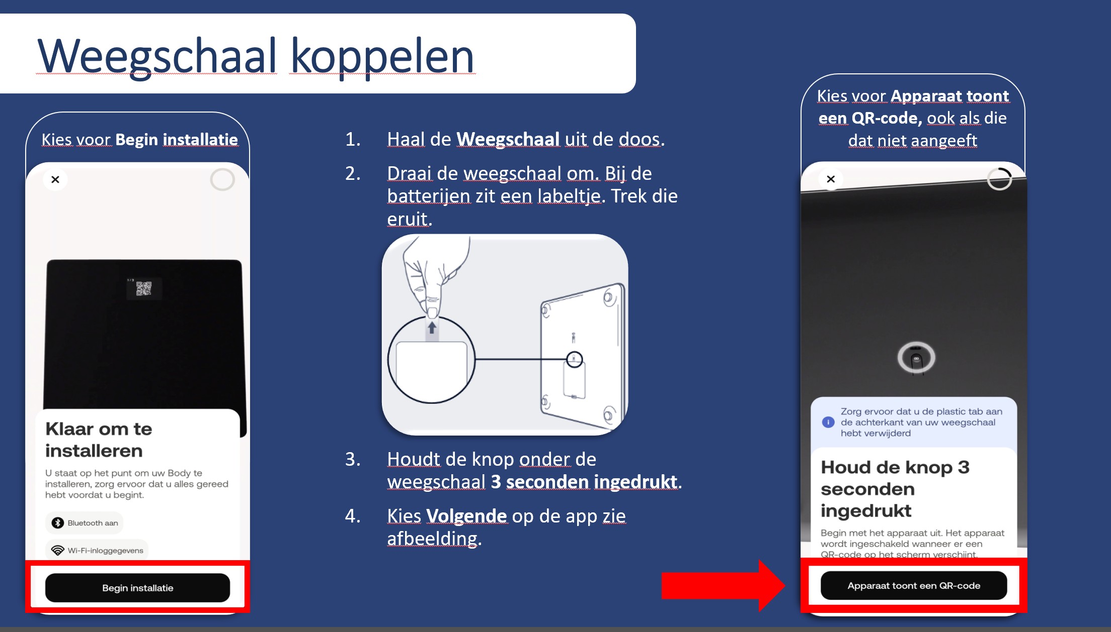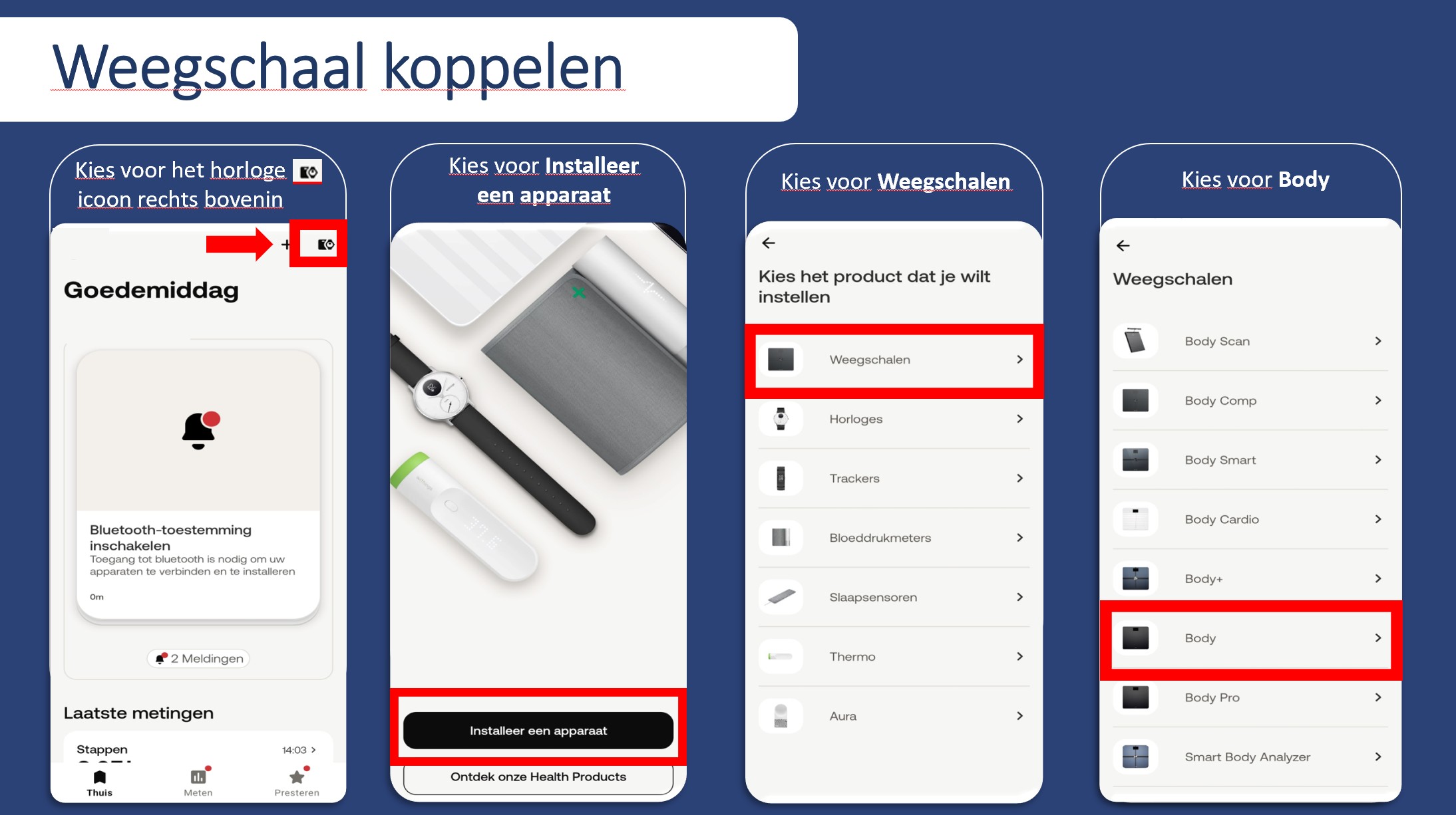 Withings BPM Connect installeren – stap voor stap Bekijk de video of volg de stappen hieronder. 1. Rechts bovenin zie je een weegschaal en een horloge. Daar klik je op. 2. Dan zie je dit scherm. Klik op Installeer een apparaat. 3. Klik dan op ...