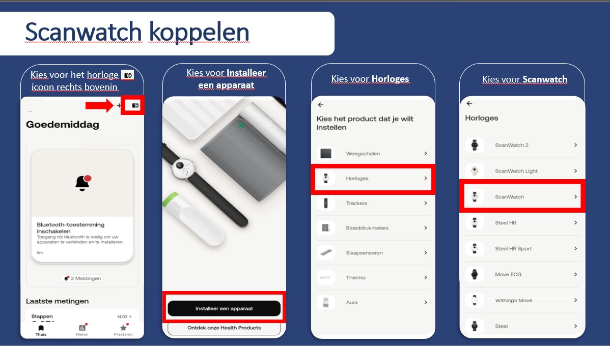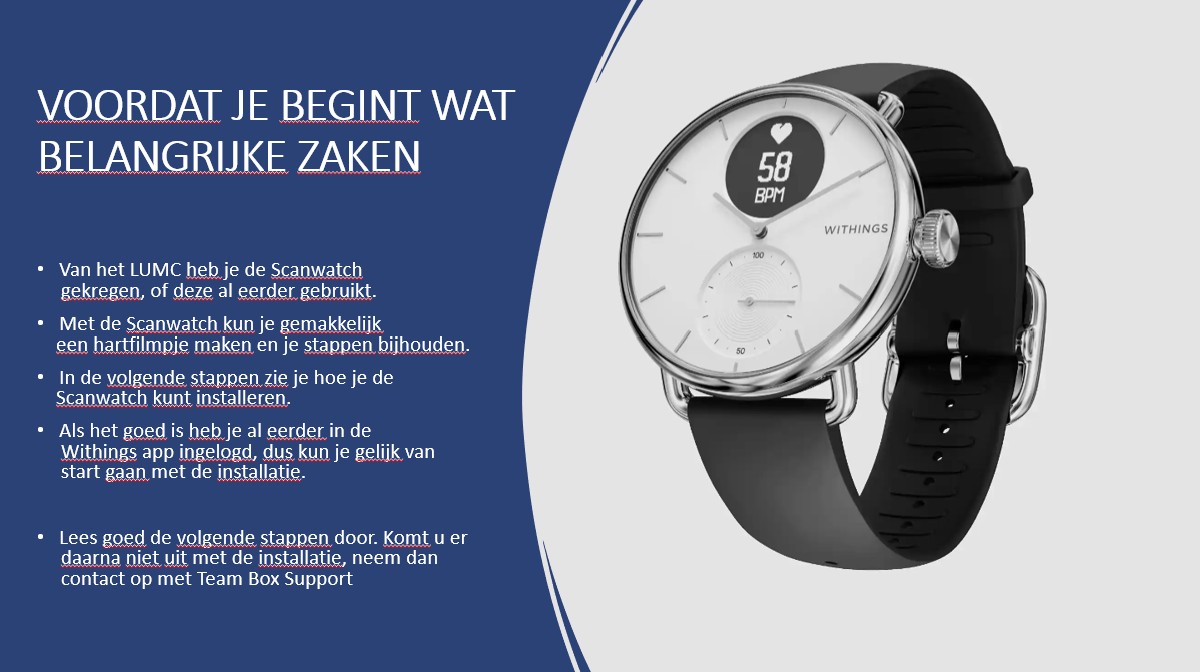 Voordat je begint wat belangrijke zaken Van het LUMC heb je een Scanwatch 2 gekregen, of deze al eerder gebruikt. Met de Scanwatch 2 kun je gemakkelijk een hartfilmpje maken en je stappen bijhouden. In de volgende stappen zie je hoe je de Scanwatch 2 ...